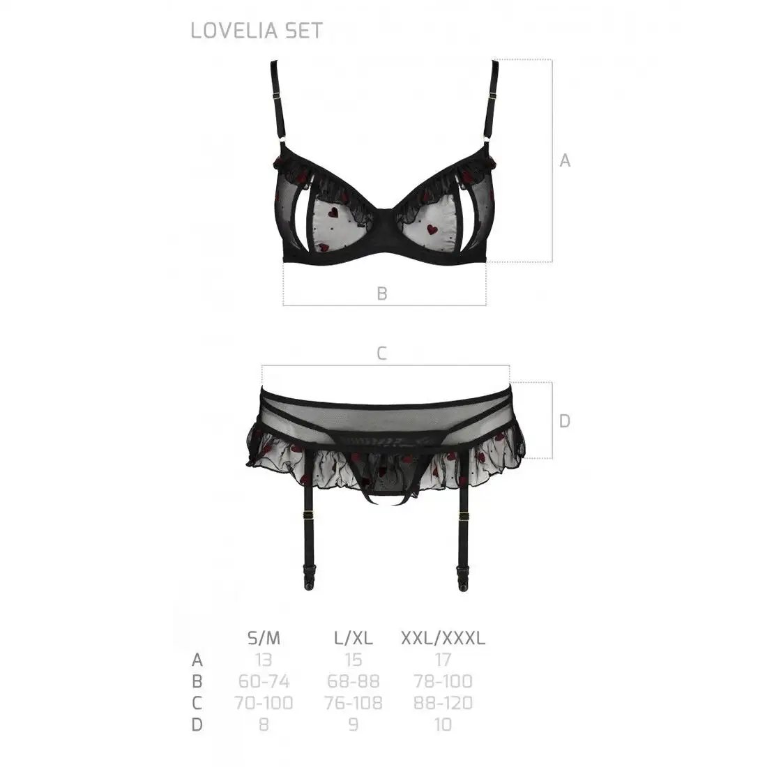 КОМПЛЕКТ LOVELIA в черном цвете XXL/XXXL от Passion станет прекрасным дополнением к вашей коллекции нижнего белья. Этот потрясающий комплект включает в себя бюстгальтер, пояс для чулок и стринги, изготовленные из высококачественных материалов, удобных и прочных.