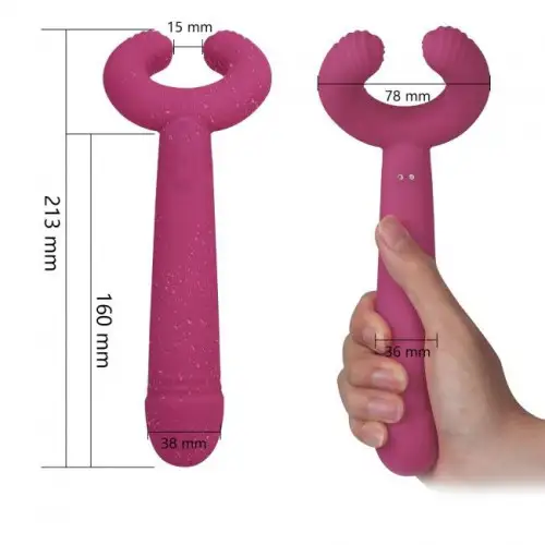 Первый мотор расположен на кончике вибратора, обеспечивая интенсивную стимуляцию самых чувствительных зон. Второй мотор расположен посередине вала, производя глубокие вибрации, которые заставят вас дрожать от удовольствия. И, наконец, третий двигатель расположен в основании игрушки и обеспечивает дополнительную стимуляцию клитора или промежности.