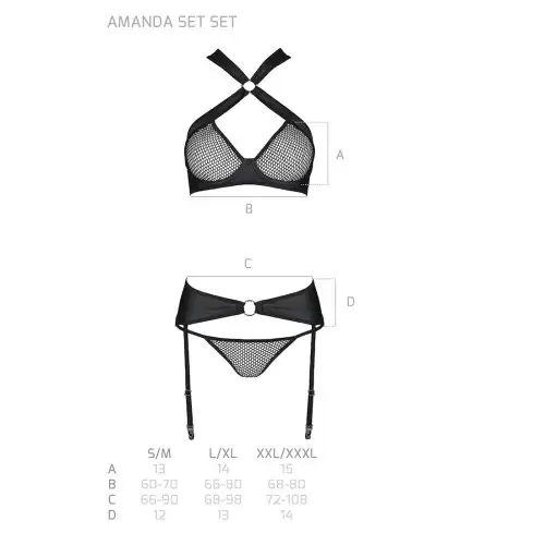 Этот комплект нижнего белья идеально подходит для тех особых случаев, когда вы хотите чувствовать себя уверенно, сексуально и соблазнительно. Будь то для себя или в качестве подарка для кого-то особенного, черный комплект Amanda Set L/XL - Passion не разочарует.