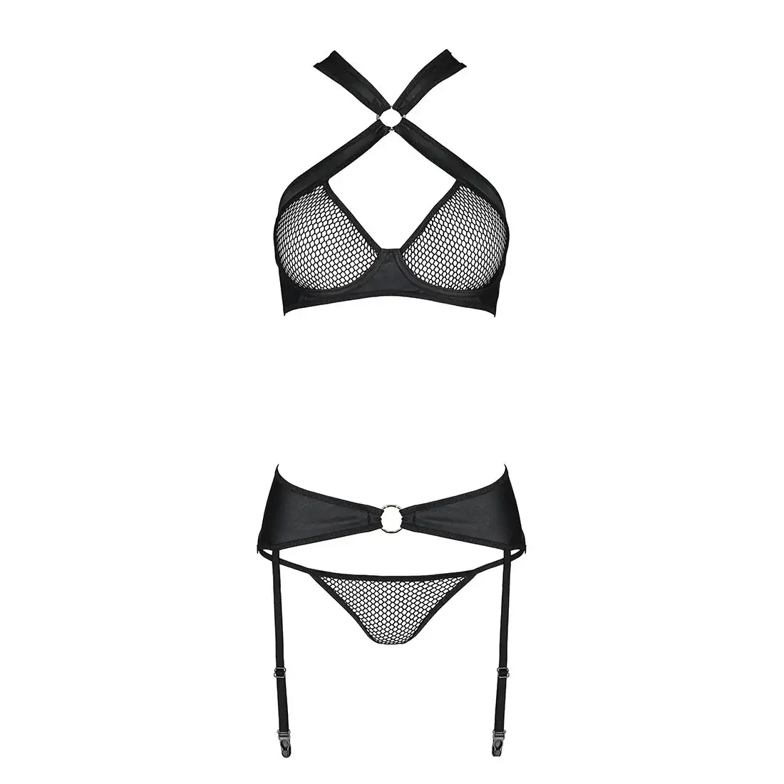 Сетчатый набор: бюстгальтер с халтером, трусики и пояс для чулок Amanda Set black L/XL - Passion