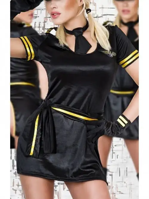 Отправьтесь с Вашим любимым в самое яркое путешествие в Вашей жизни! Мы желаем Вам приятного полета. Сногсшибательный комплект украшен яркими желтыми полосочками. В комплект входят: коротенькое платье, пояс, галстук, перчатки, фуражка и стринги.