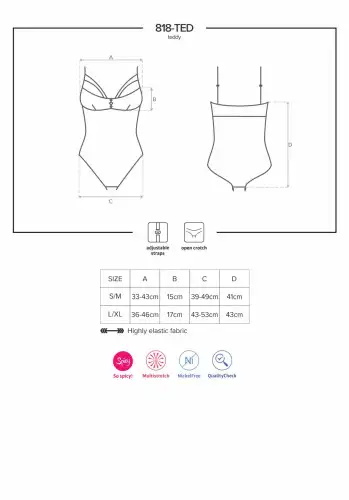 Если вы хотите оживить свою личную жизнь или просто хотите чувствовать себя сексуально и уверенно в собственной шкуре, боди Obsessive 818-TED-1 S/M — идеальный выбор. Так зачем ждать? Добавьте его в корзину сегодня и начните чувствовать себя богиней, которой вы являетесь!