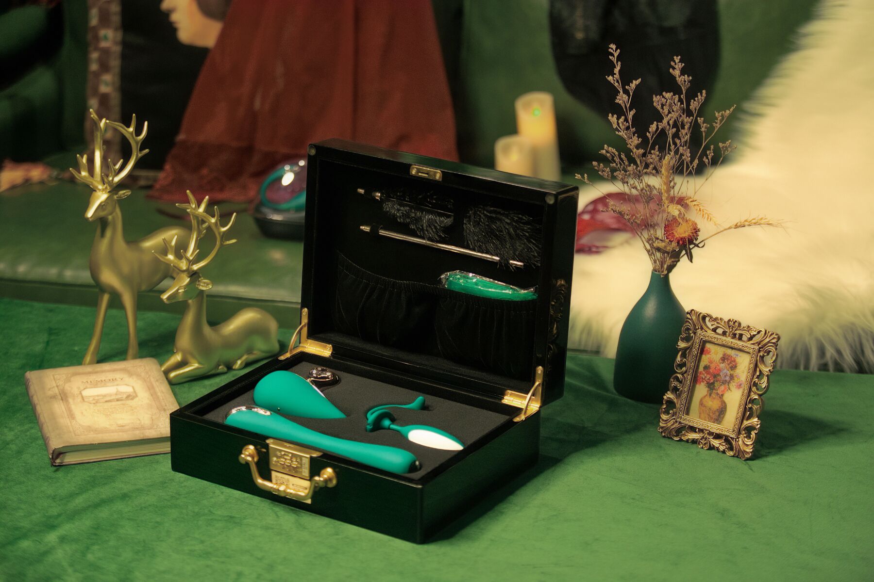 Кейc Pandora Box выполнен из материала под полированное дерево с золотистой фурнитурой и оснащен надежным кодовым замком. Внутри — специальные отделения для каждой игрушки, крепления для аксессуаров и бархатные кармашки для зарядных кабелей и инструкции.