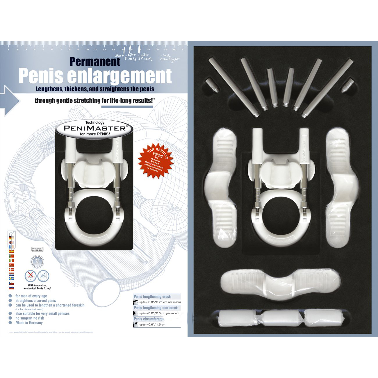 Рост полового члена с Penimaster CHROME — это гарантированное последствие, которое обладает постоянным эффектом. Увеличение происходит за счет деления и роста клеток тканей, что происходит при ношении устройства. При перерывах результат фиксируется, и длина пениса остается стабильной.