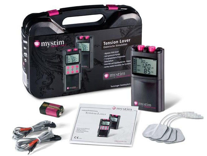 Электростимулятор MYSTIM TENSION LOVER. Имеет 4 самоклеющихся электрода, 7 различных программ - от нежного пощипывания до ритмичной пульсации. Есть большой и удобный дисплей для программирования режимов.