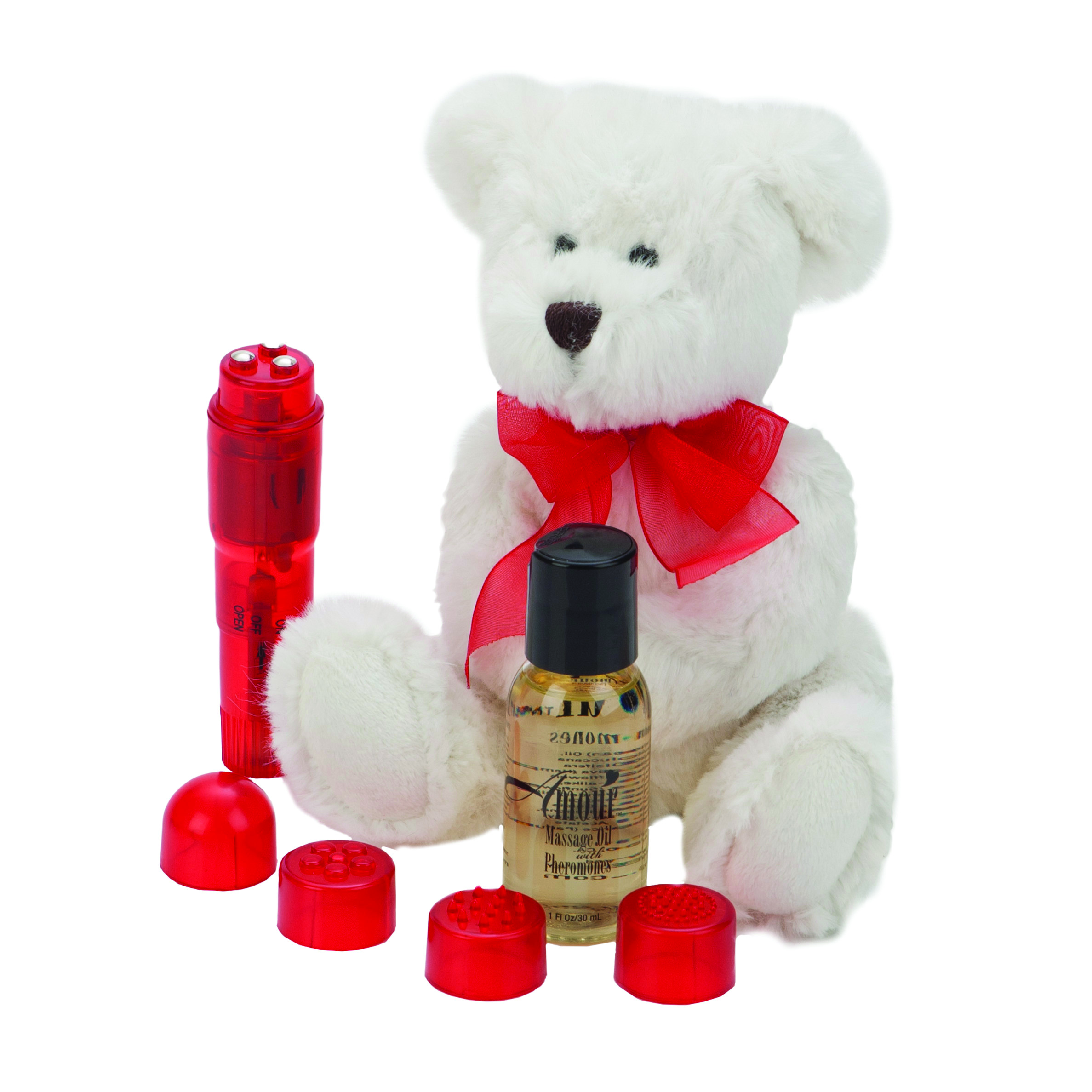 Секс набор AMOUR BE MINE CUDDLE MASSAGE KIT. Оригинальный подарок своей второй половинке! В набор входят: мягкая игрушка, вибратор-массажер с 4 насадками, массажное масло с феромонами. Длина вибратора – 10 см, диаметр – 2,5 см. Питание: 1 батарейка АА (входит в комплект).