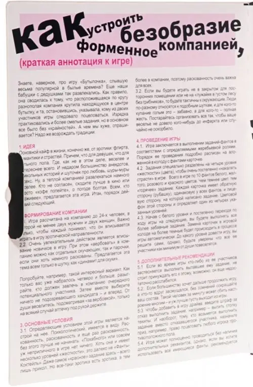 В набор входит все необходимое для начала, включая подробные инструкции по игре. Так зачем ждать? Закажите свою Игру Фанты "Флирт №8 Бутылочка" сегодня и начните исследовать все захватывающие возможности, которые ждут вас!