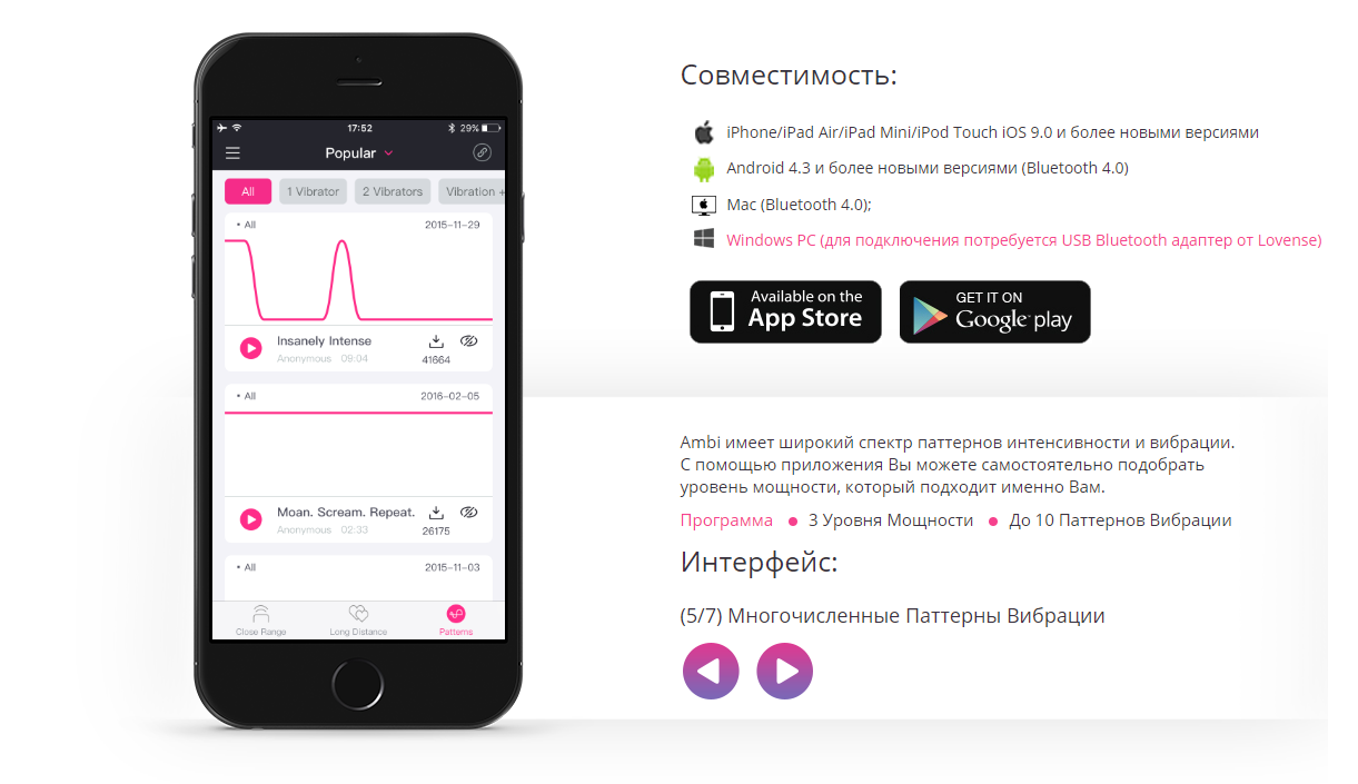 Так как вибратор Lovense – Ambi является технологической новинкой, основные его достоинства связаны с этой сферой: