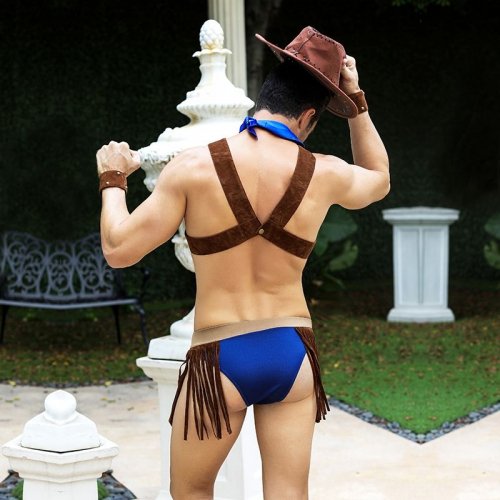 Подчеркнуть красоту мужской фигуры и рельеф плеч призваны ремни от наплечной кобуры, украшенные металлическими заклепками. Синие трусы с широкой резинкой по бокам украшены бахромой, обращающей внимание на бедра и ягодицы.