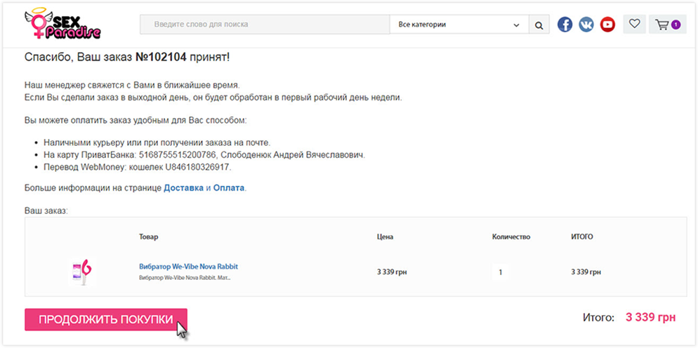 Чтобы вернуться в магазин, нажмите кнопку «ПРОДОЛЖИТЬ ПОКУПКИ».